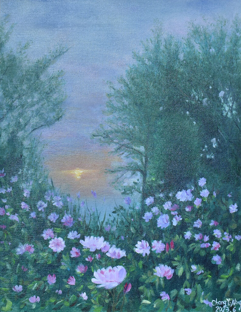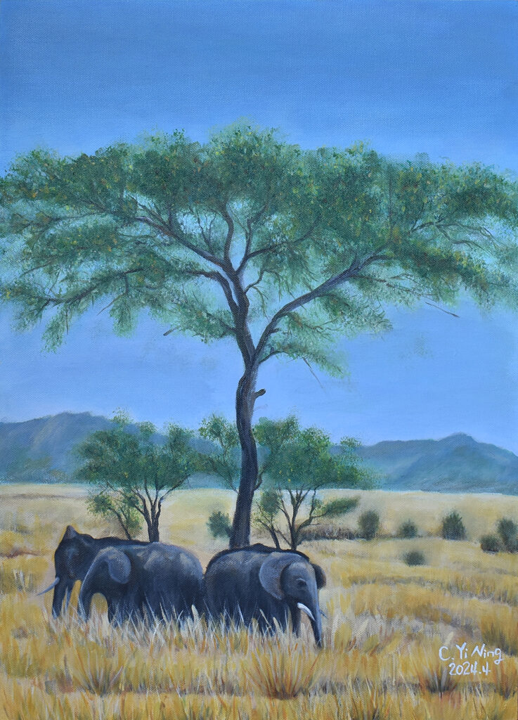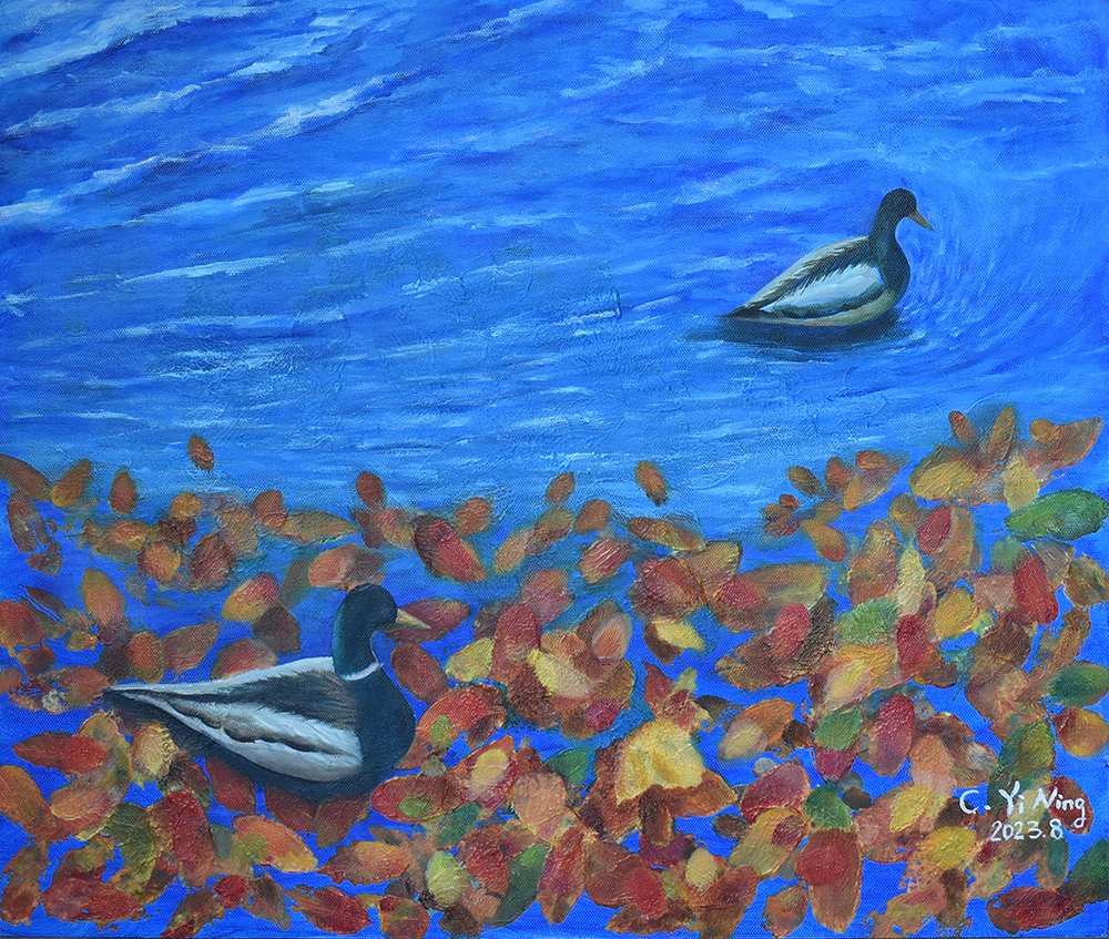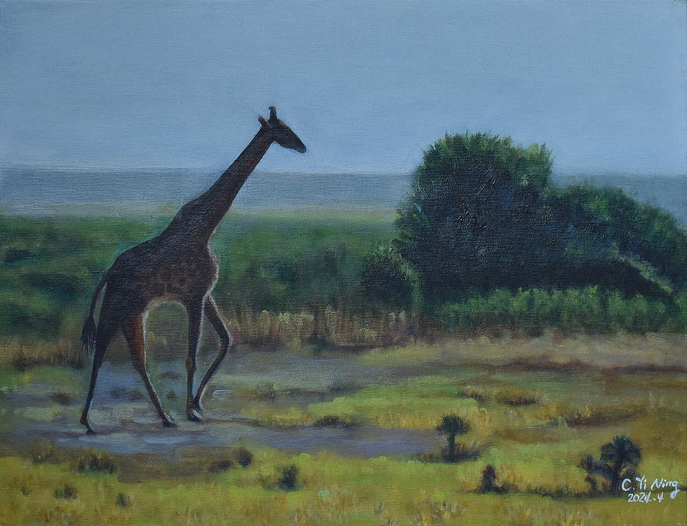 從小熱愛動物和大自然,熱心公益、愛心不落人後的貽甯,自2020年起開始畫畫。師承畫家王俊棠,她利用壓克力原料凸顯色彩層次,層層堆疊出遠景近物,無論風景或海景、靜物或動物,都充分將光影變化以其自然筆觸運用得恰到好處。第二批的畫作從「宜蘭落雨松」到「以茶相待」,每一幅畫作都呈現出她愛動物的心與對大自然的尊敬。