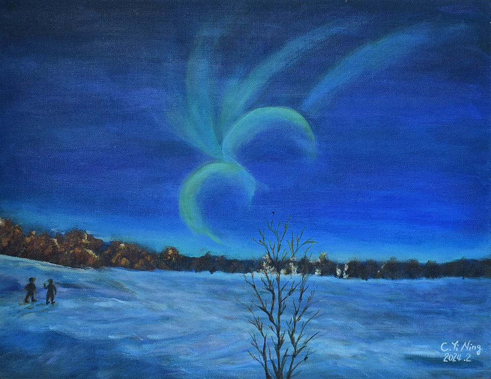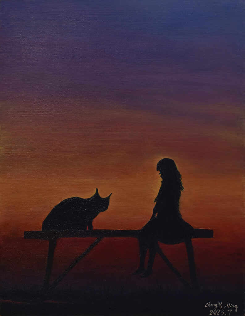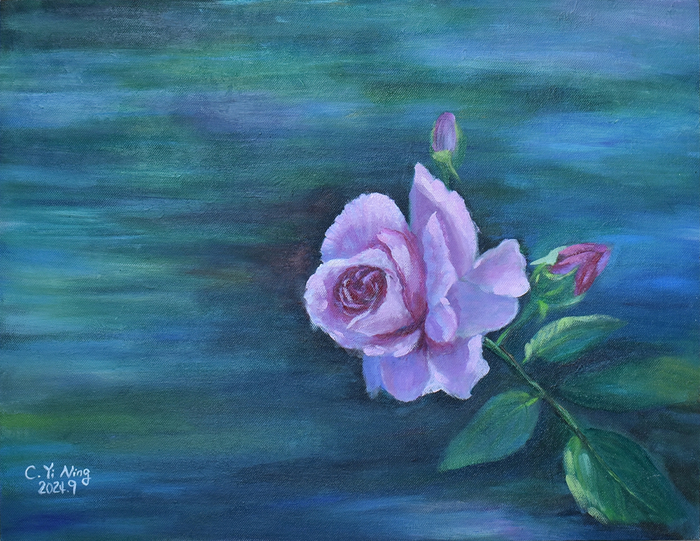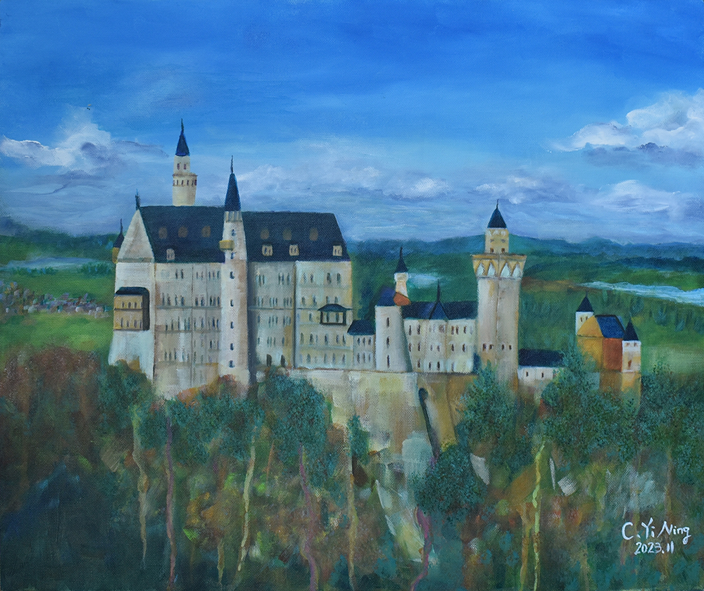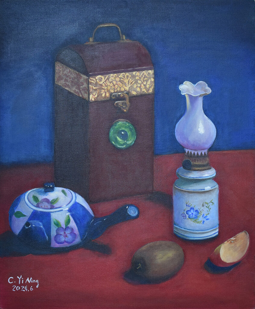 從小熱愛動物和大自然,熱心公益、愛心不落人後的貽甯,自2020年起開始畫畫。師承畫家王俊棠,她利用壓克力原料凸顯色彩層次,層層堆疊出遠景近物,無論風景或海景、靜物或動物,都充分將光影變化以其自然筆觸運用得恰到好處。第二批的畫作從「宜蘭落雨松」到「以茶相待」,每一幅畫作都呈現出她愛動物的心與對大自然的尊敬。