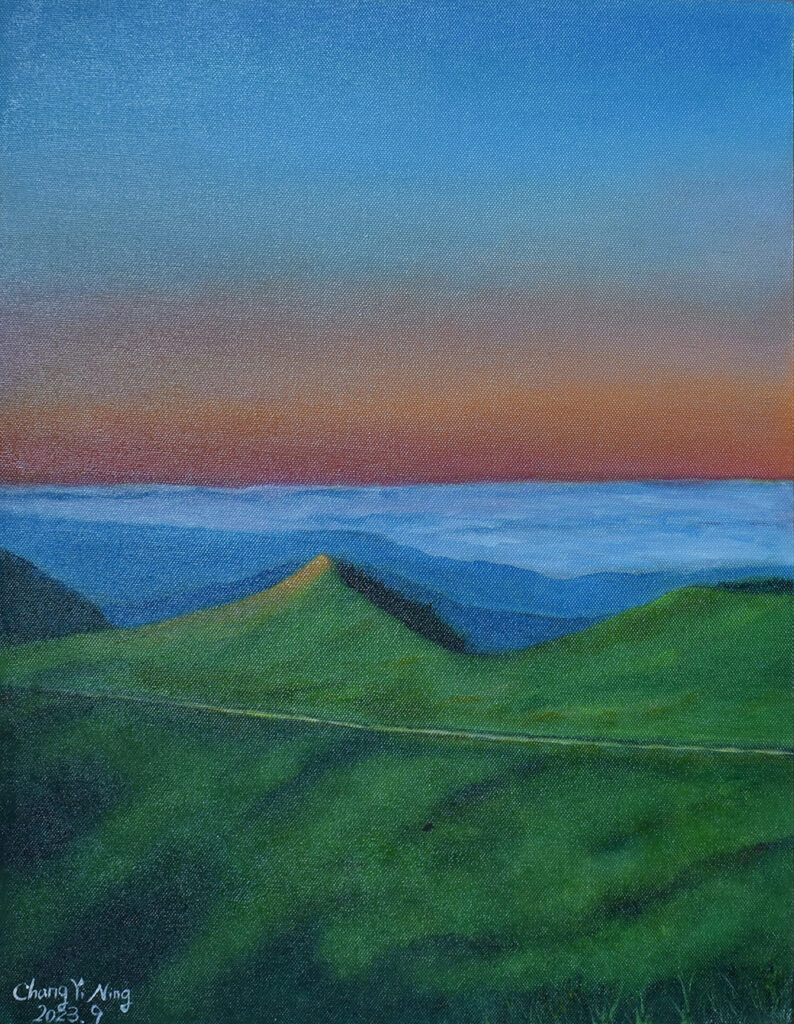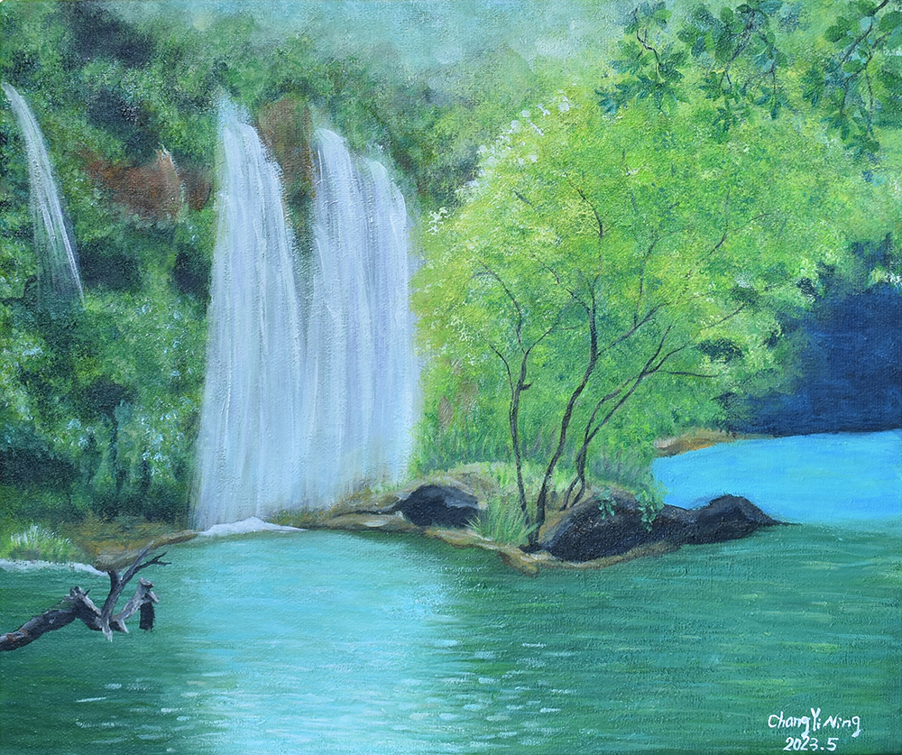 1)「宜蘭落雨松」及「靜謐。瀑布」:這兩幅畫作的尺寸較大,因此,
