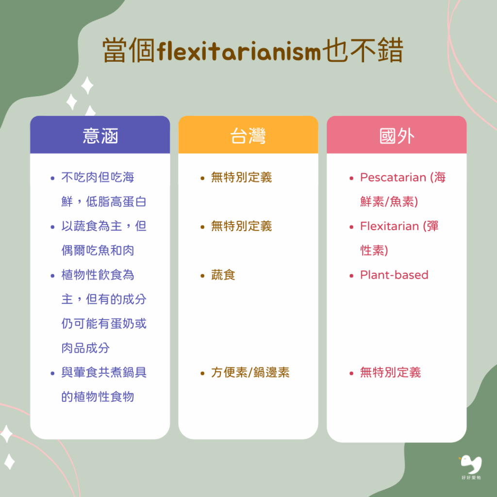 而近年來,又有一種Flexitarian,彈性素食主義,意指日常飲食以蔬果為主,偶爾食用肉品或海鮮,對於仍以肉品為主食的大多數人來說,這是一種較無壓力而且立即可做的動物友善行動,你可以從一盤菜換肉,一餐蔬食代替肉食,一日蔬食,慢慢加大選擇蔬食的頻率,無形之中,就幫助了許多經濟動物。