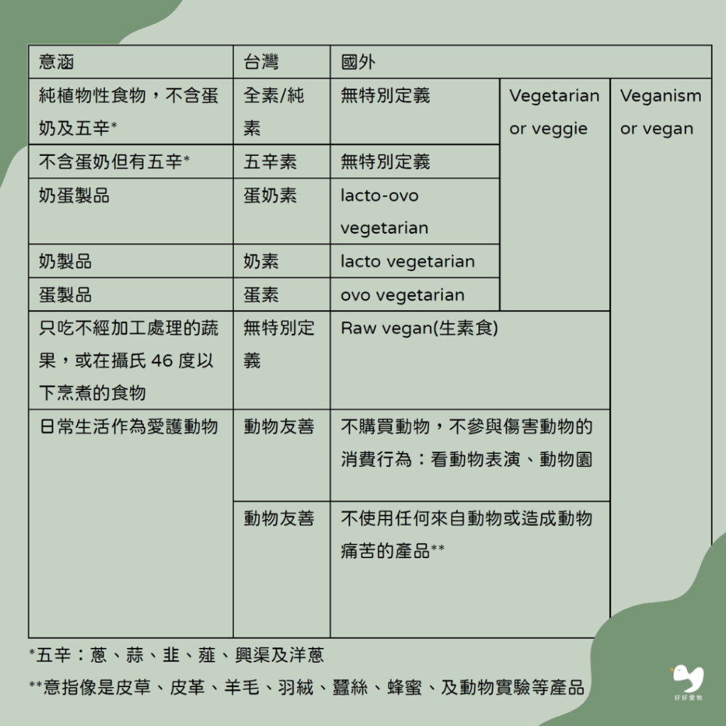 關於蔬食或吃素,你應該聽過veganism(簡稱vegan)和vegetarian,把國內外已知對於素食或蔬食定義做一整理,vegan指的是全面動物友善的生活態度,不只注意飲食或用品上不傷害動物,更強調不購買動物或參與傷害動物的消費行為,例如不看動物表演、不去動物園,簡單地說,vegan不對動物做任何利用,在食、衣、住、行、育、樂、用方面,都過著動物友善的生活。