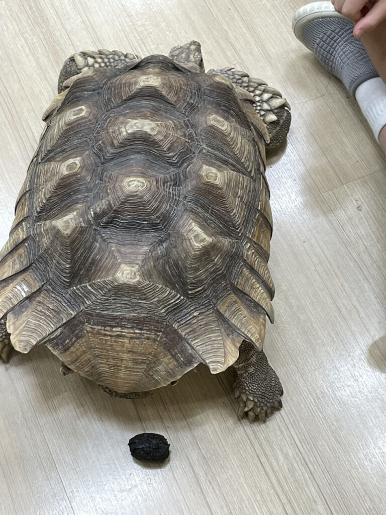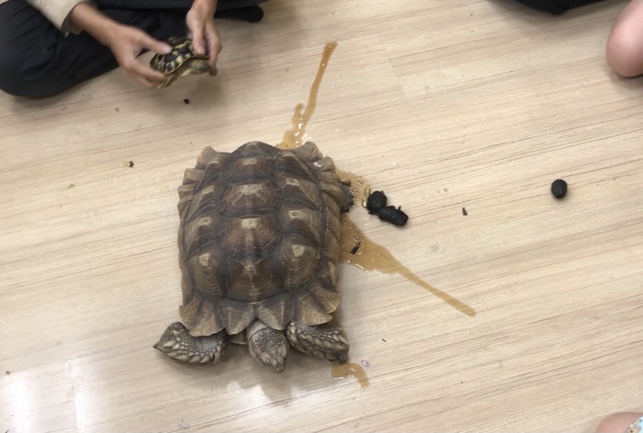 老師:….尿尿也很正常啊,而且其實這些大便還很「新鮮」,食物進到陸龜的肚子,通常沒有消化完全就直接排出,所以陸龜會再把它吃進去,讓腸胃再去消化喔。
