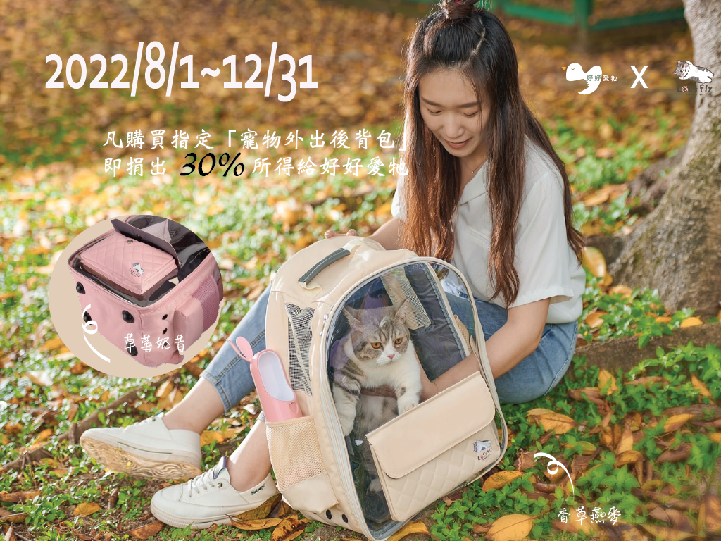 即日起至2022/12/31止,只要購買「寵物外出後背包」,mei714就會捐出其營收30%給好好愛牠協會,讓我們一起共同響應動物友善的理念,領養代替購買,也把同伴動物當家人,一起好好愛牠!