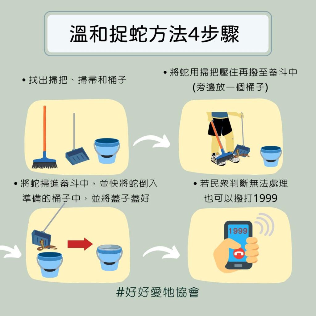 當然,無論用何種方式捕捉,在靠近動物前,請盡量將物種的特徵記下並且拍照;若有意外發生,才能有順利的執行醫療程序。透過這篇文章,我們也希望分享台北市動保處建議的較溫和的捉蛇方法,供各位參考(https://conservation.forest.gov.tw/0001921)。若民眾判斷無法處理,也可以撥打1999台灣地方政府民眾服務專線。