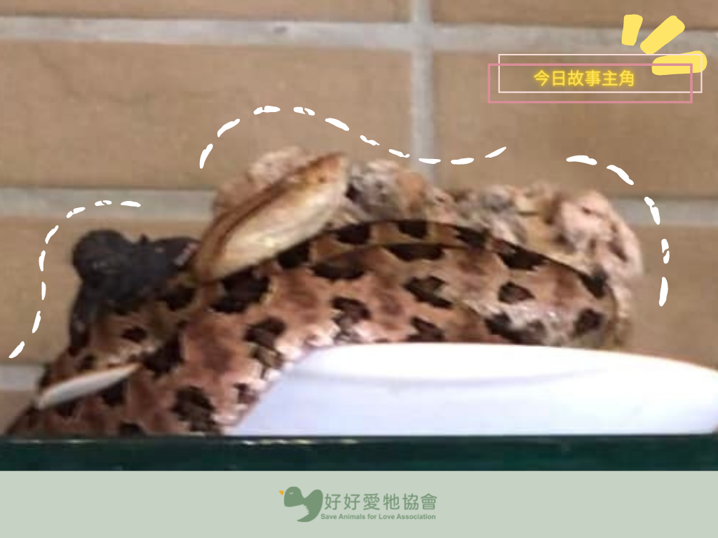 2021年冬天,一隻身上有著黑色斑塊的小龜殼花,來到我們家休息。當時他正捲縮在我們家廚房外的盤子上曬太陽,瞳孔呈現一條縫狀。印象我當時一看到他就開始心跳加速,他那時正瞇著瞳孔,享受他的日光浴(蛇瞇瞳孔的樣子實在是太可愛了~)。