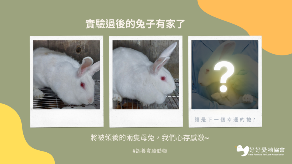 在台灣,2021年的實驗動物數量有567萬隻,若扣掉胚胎(雞胚、鴨胚、魚胚)數量,被實驗的活體動物有119萬隻,包含嚙齒類、魚類、雞、兔、豬、兩棲類、鴨、鵝、禽類、爬蟲類、羊、牛、雪貂、其他哺乳類、犬、貓、猿猴、馬、鹿。到實驗結束存活下來的動物不到7%,其中不乏健康無病的動物,若沒有進一步的安置或轉讓,就只能被安樂死。協會成立後,也想建立實驗動物媒合的平台,我們希望多一點動物被拯救,我們嘗試聯繫國內主要動物實驗中心,共計有18所大學或醫院的研究單位,扣除沒有回應的5所,無認養程序的2所,要再評估的有1所,共計10所單位均有善意回應,表示有適合的案件會主動聯繫,並在111年2月,完成了2隻實驗兔的認養,至此一直未收到領養的消息,直到11月8日才等到另兩隻待領養大白兔的通知,也幸運的在11月13日順利完成送養。
