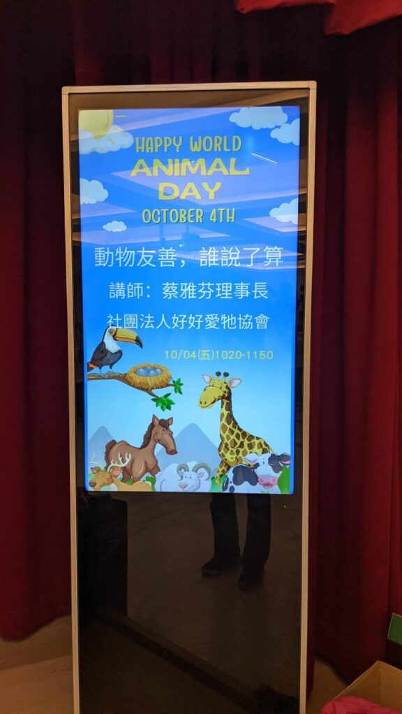 最後讓同學發表課程心得,說出願意幫助的動物時,有一位男生說想幫助豬,少吃肉,讓我們十分感動,也有人想要登記領養實驗動物。