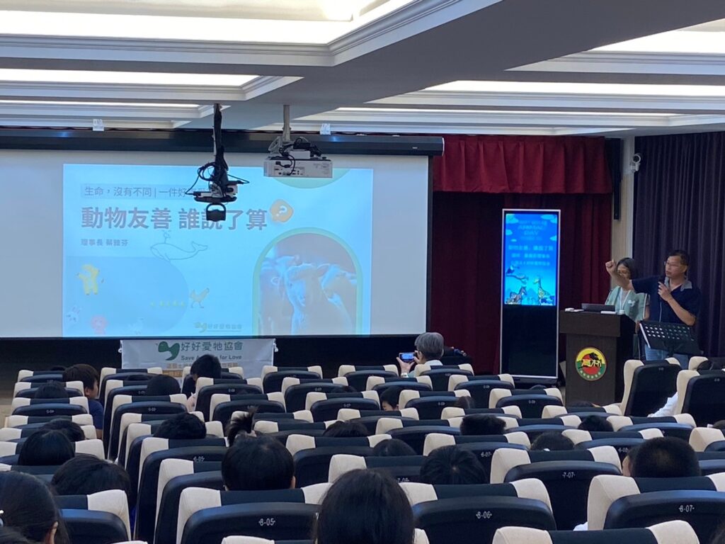 理事長蔡雅芬為課程下了一個標題:「動物友善,誰說了算?」,陳主任為我們做了很好的開場,也請來校長勉勵同學。接著理事長和同學分享什麼是弱勢的動物。一開始同學們舉手搶著回答,大多還是流浪貓狗,理事長拿圖片舉例,豬和流浪貓,誰比較弱勢?在下一頁看到烤豬肉和在家裡睡著正甜的貓,大家就明白了,弱勢動物,是比較而來的。