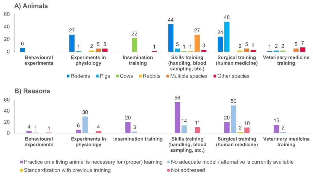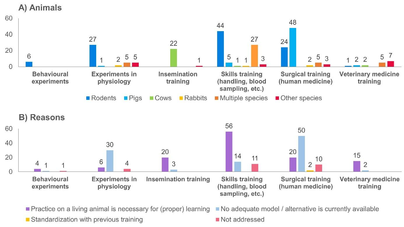 A)動物:因不同目的而使用的動物,鼠、豬、牛、兔等。 B)理由:為何未實行「替代原則」(Replacement principle)。