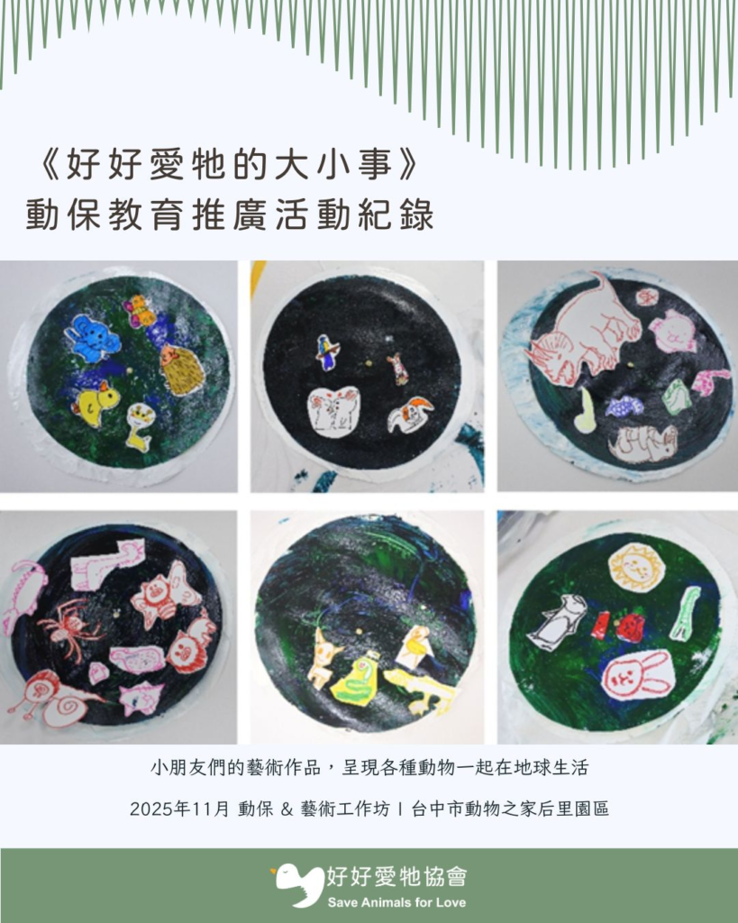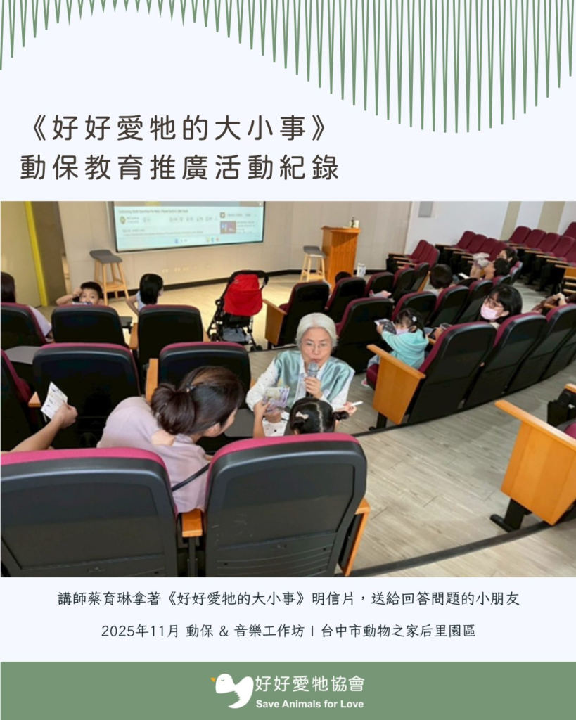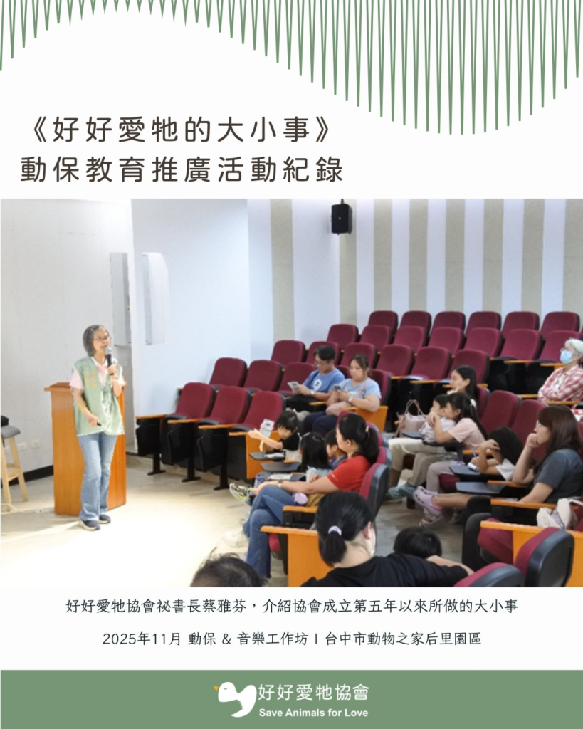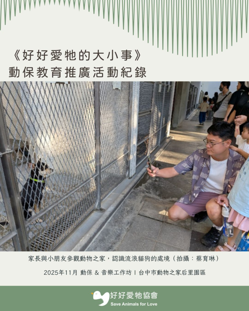 2025年11月連續四個周六,在台中市動物之家后里園區的支持下,好好愛牠協會於舉辦了四場動保教育活動,邀請親子們一邊玩一邊學習「愛牠、懂牠」的大小事。活動分為三大主軸,包括動保講座、音樂與藝術工作坊、后里園區導覽,希望寓教於樂,讓大小朋友更加認識動物、友善動物,並從音樂與藝術中感受生命的美好。