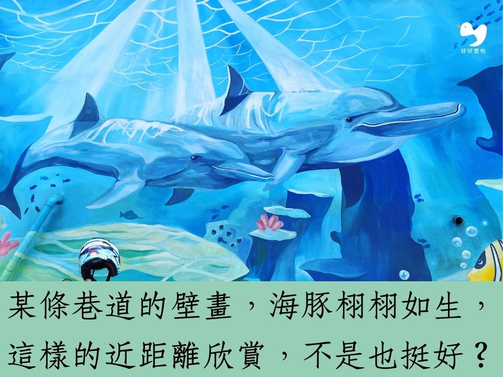 小編曾在板橋某條巷道,看到這栩栩如生的海底世界,近距離的欣賞壁畫中的海豚,不是也挺好?