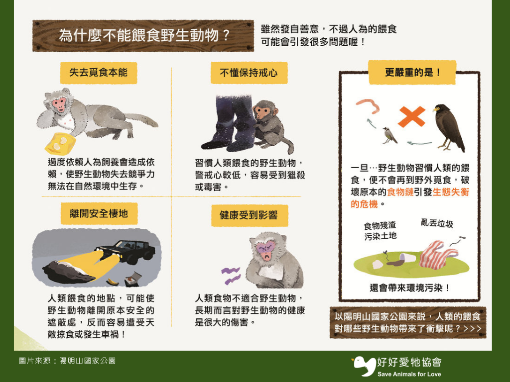 陽明山國家公園管理處並非只是單方面要求禁止擅自餵食遊蕩動物,還進一步與雙北市動物主管機關合作,針對遊蕩犬進行移地安置及結紮,也委託專家學者進行區內族群數量調查及監測,加強培力志工監測、通報及警力加強取締違規餵食者,為的是希望能有效改善遊蕩犬與野生動物衝突的問題。我們在市集活動回收的承諾卡中,有超過8成的大人和小朋友認同”不隨意餵養野生動物,不騷擾牠”,顯示多數人願意落實這項承諾,這是一個很棒的承諾,不能餵食野生動物的原因,在陽明山國家公園網站也有詳細的說明:
