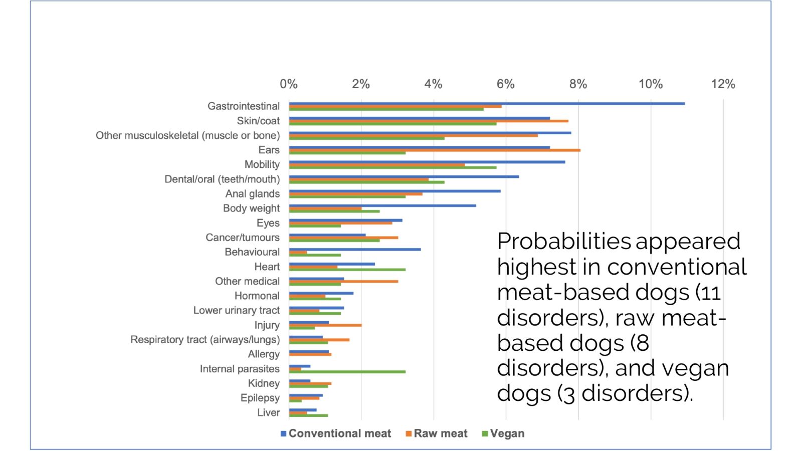 奈特教授於2022年發表研究結果,共調查2536隻狗,分為三種飲食方式:傳統肉類(1370隻)、生肉(830隻)、純素(336隻)。予以分析7項健康指標、22種疾病發生率,結果顯示:患病率最高的是吃傳統肉類飲食的狗(49%,11種疾病),其次是吃生肉飲食的狗(43%,8種疾病),最低的是吃純素飲食的狗(36%,3種疾病)。結論是對狗而言,最健康且風險最低的飲食選擇,就是營養完善的純素飲食。