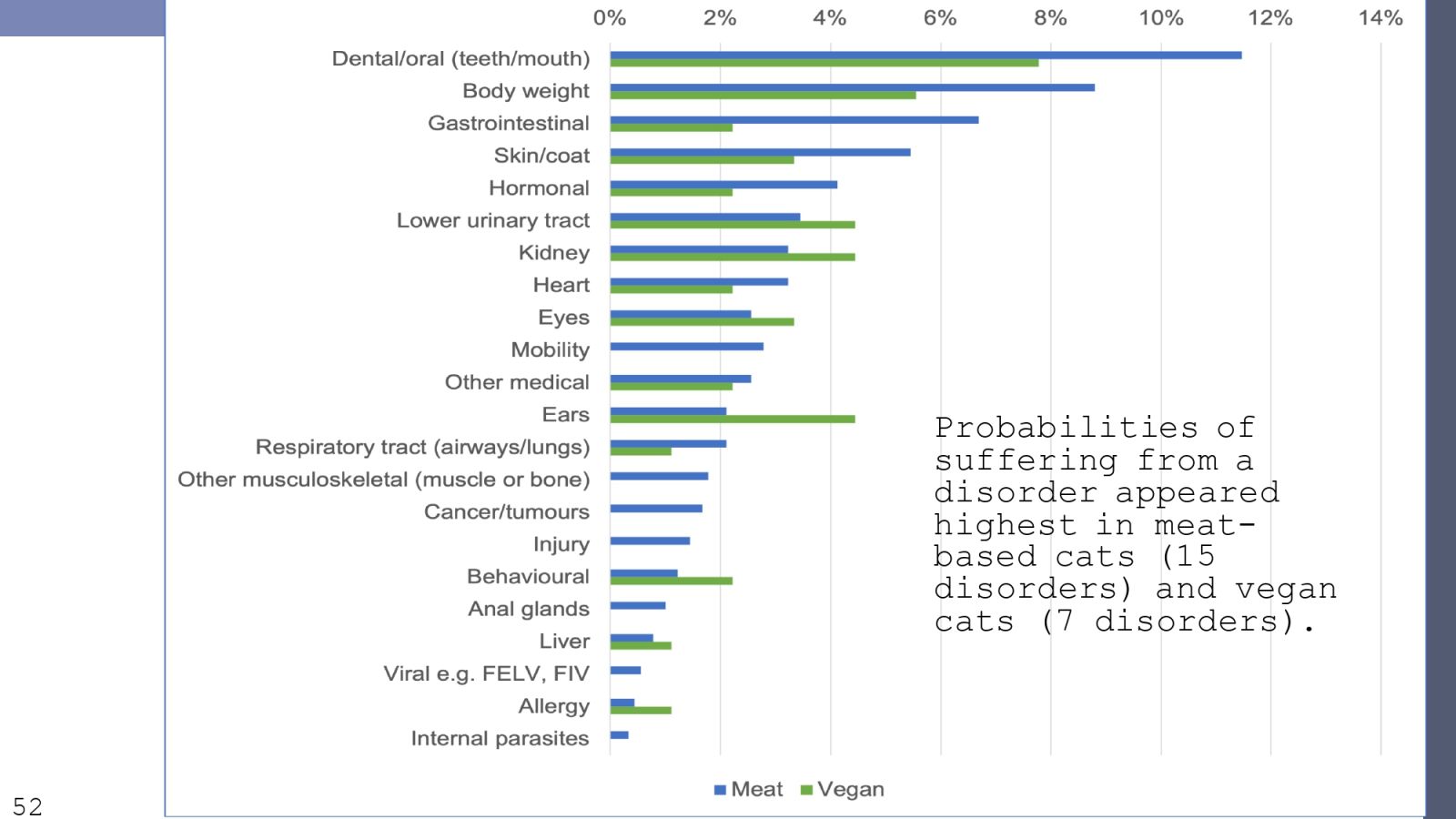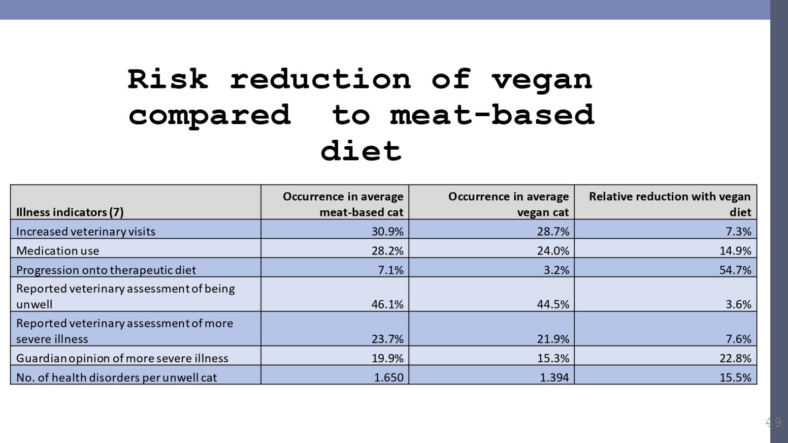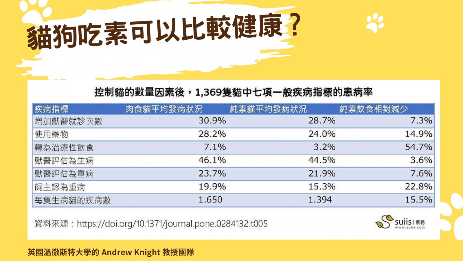 對於純素飲食的貓,奈特教授也有相關研究,共調查1242隻吃肉食為主的貓、127隻吃純素食的貓,並觀察7項疾病指標。結果顯示,吃純素食的貓在所有疾病的得病機率都較低,風險降低的比例從3.6%到54.7%不等。