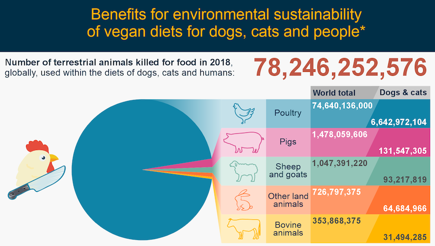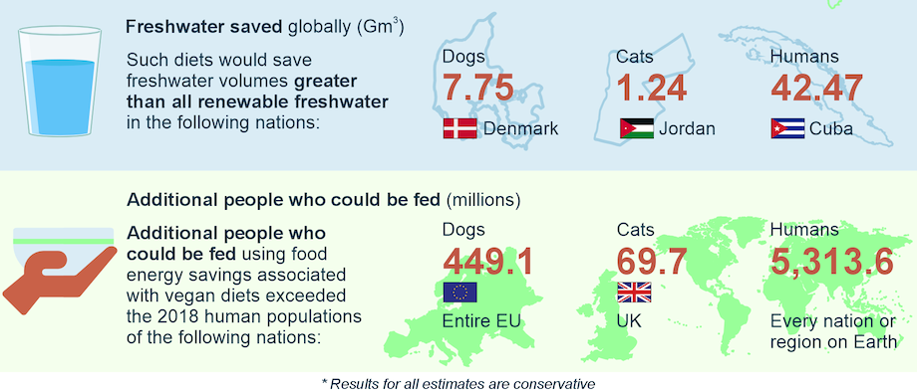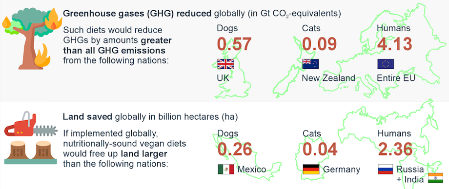 如果人類與貓狗都改用純素飲食,以下為部分影響數據: