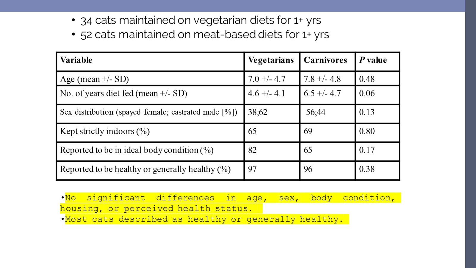 奈特教授說明,過去對於素食寵物食品的健康影響,並沒有多少科學證據,第一篇相關研究在2006年發表於《美國獸醫醫學會期刊》,由獸醫研究34隻吃素食的貓、52隻吃肉食為主的貓,大約一年後結果顯示,兩者之間的健康狀況並無顯著差異。