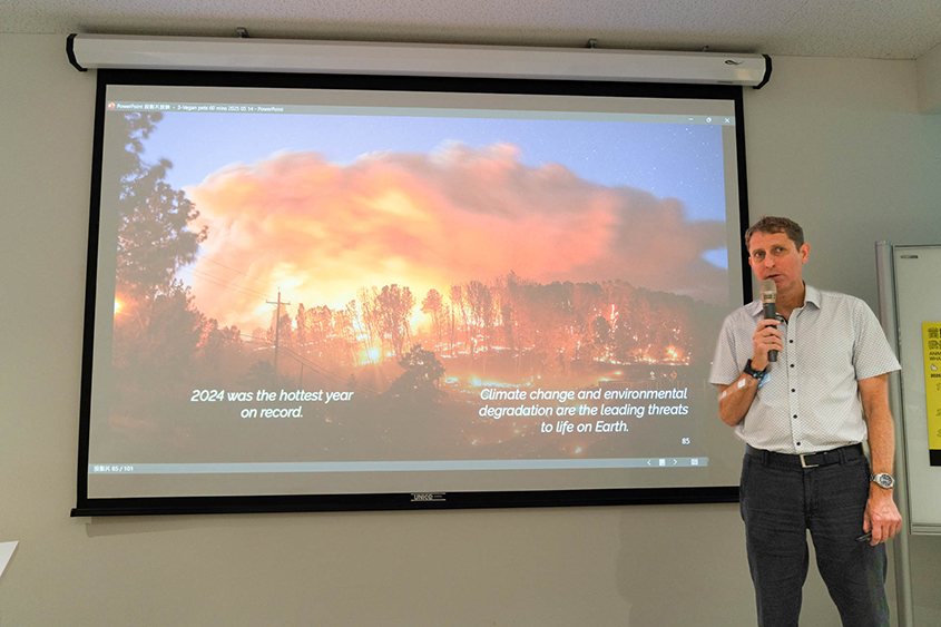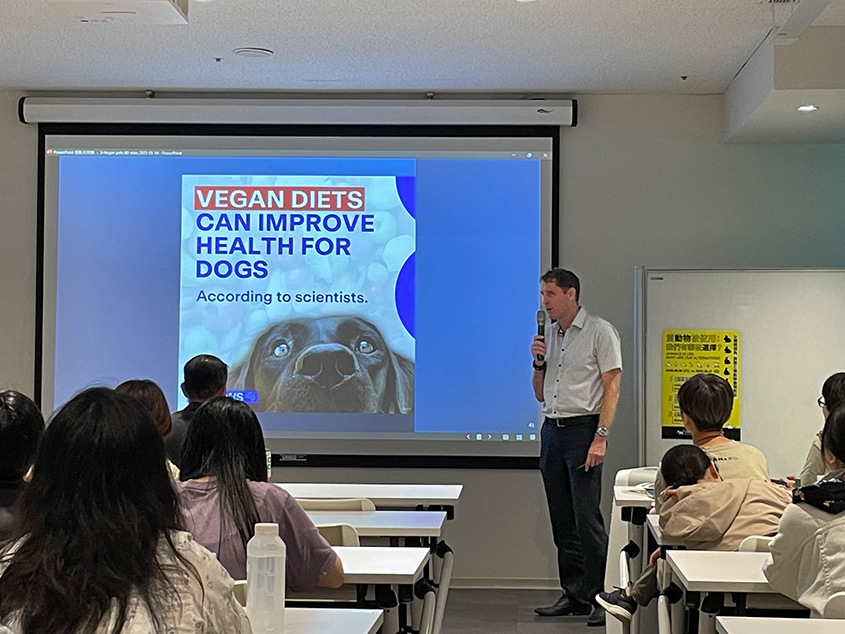 主講人安德魯・奈特(Andrew Knight)教授長期推廣動物福利、動物實驗替代方案、純素寵物食品等,這次的講題為「貓狗應該吃純素嗎?」(Should Dogs and Cats go Vegan?),他以多篇科學研究為依據,分析選擇替代性寵物食品的考量,包括健康、營養、品質以及環境永續等,證實純素寵物食品的可靠安全,對人類和地球也有極大幫助。