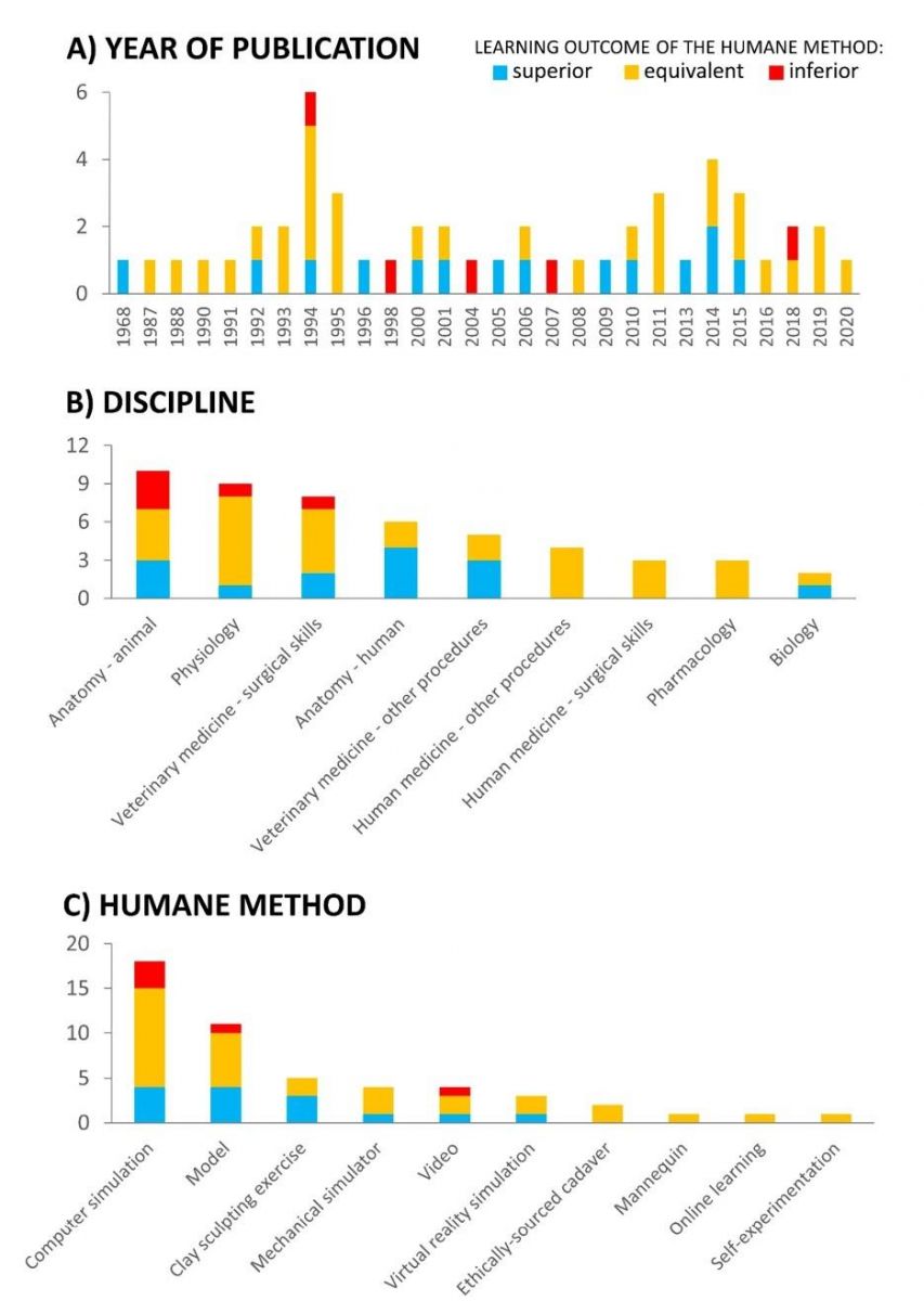為了瞭解人道教學的成效,奈特教授參與了一篇回顧文獻的研究,從1968–2020年間找出 50 篇探討「人道教學替代技術」教育成效的研究,涵蓋獸醫、醫學、生物科學等領域。結果發現,人道教學方式比起傷害動物方式,有30%學習成果更好,60%無顯著差異,10%效果略低。如果把它們相加起來,採用人道教學方式的學習成果,其實有90%一樣好或是更好。