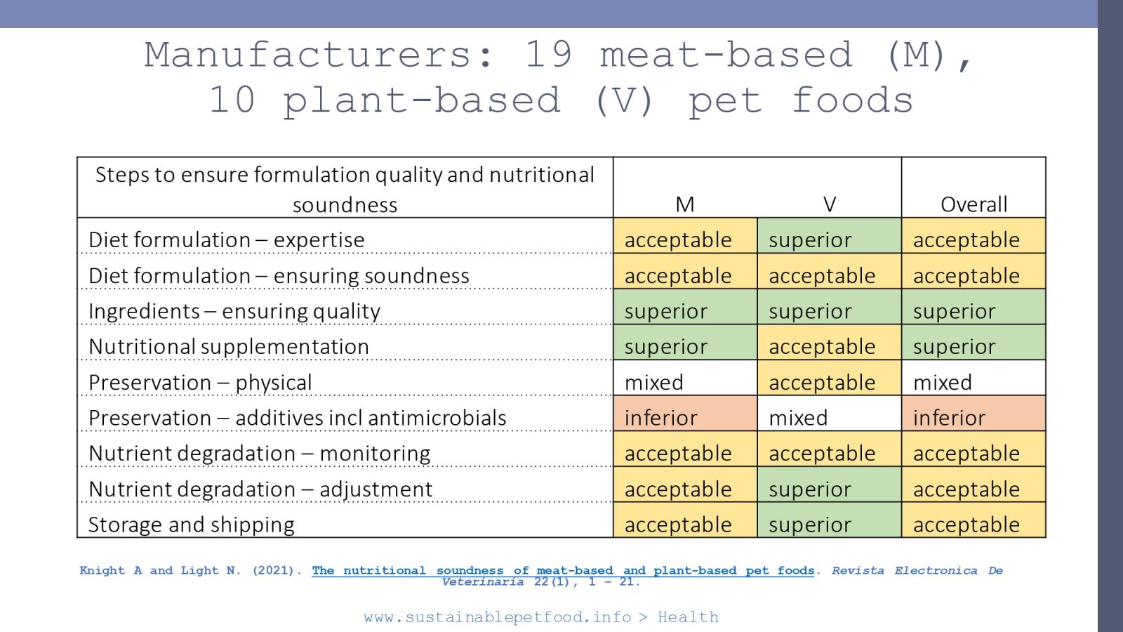 針對這兩個考量,奈特教授於2021年發表研究,比較肉類與植物性寵物食品的營養健全與品質標準,調查對象是19家生產肉類寵物食品的廠商、10家生產純素或素食寵物食品的廠商。檢視了生產流程的每個階段,是否有與專家合作設計配方?是否符合國際的營養指引?如何確保原料品質?是否有補充所有必要營養素?